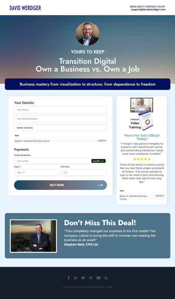Discover how we transformed an outdated platform into a powerful digital presence, using WordPress and ClickFunnels to drive book sales, integrate SavvyCal for streamlined booking, and implement a modern, SEO-ready design that solidified David Werdiger’s position as a thought leader.